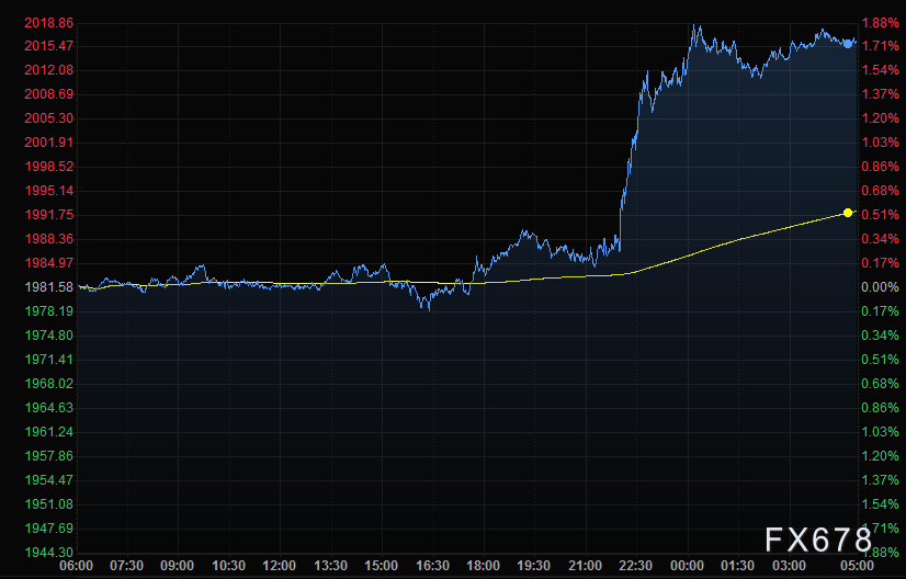 现货黄金周二跳涨1.77%,至2016.75美元/盎司,此前曾触及4月14日以来最高2019.27美元。美国期金收高1.6%,报2023.30美元/盎司。