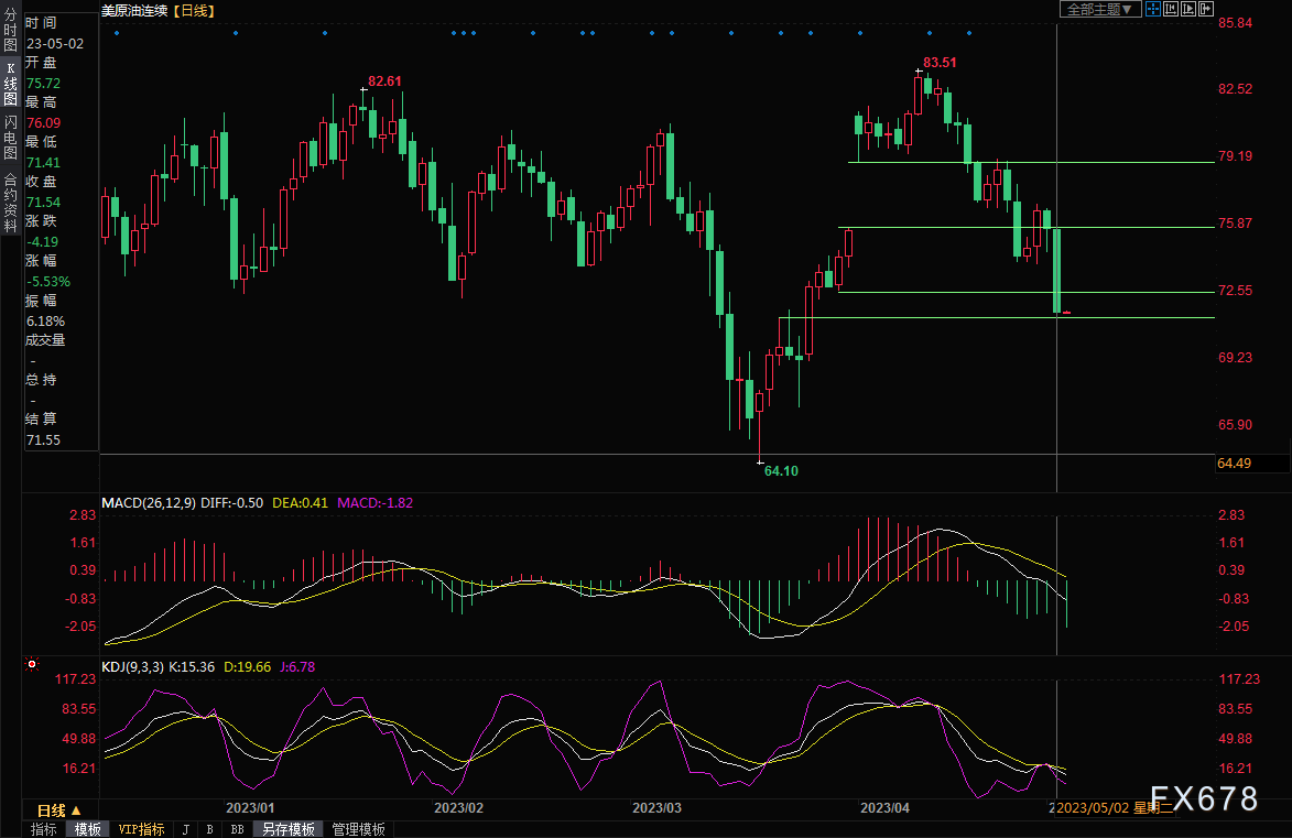 油价周二重挫约5%,至五周最低,受累于经济担忧,美国政府和国会正在讨论如何避免债务违约,同时投资者为本周进一步加息做准备。