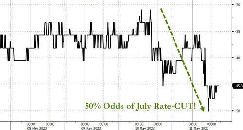 与此同时,尽管美联储鹰派官员仍在喊话,但包括银行业危机和债务上限等一系列的市场风险因素,正在导致交易员们对美联储7月降息的预期持续升温!