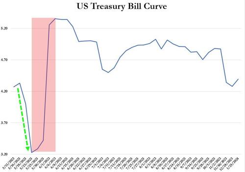 目前,美国短期国库券的收益率曲线已经彻底错位。由于大量投资者抢购,在违约触发的“X日”(大概率是6月1日)前的二级市场国库券收益率大跌。而由于风险极高,一个月期左右的国库券收益率则高达惊人的约5.5%。