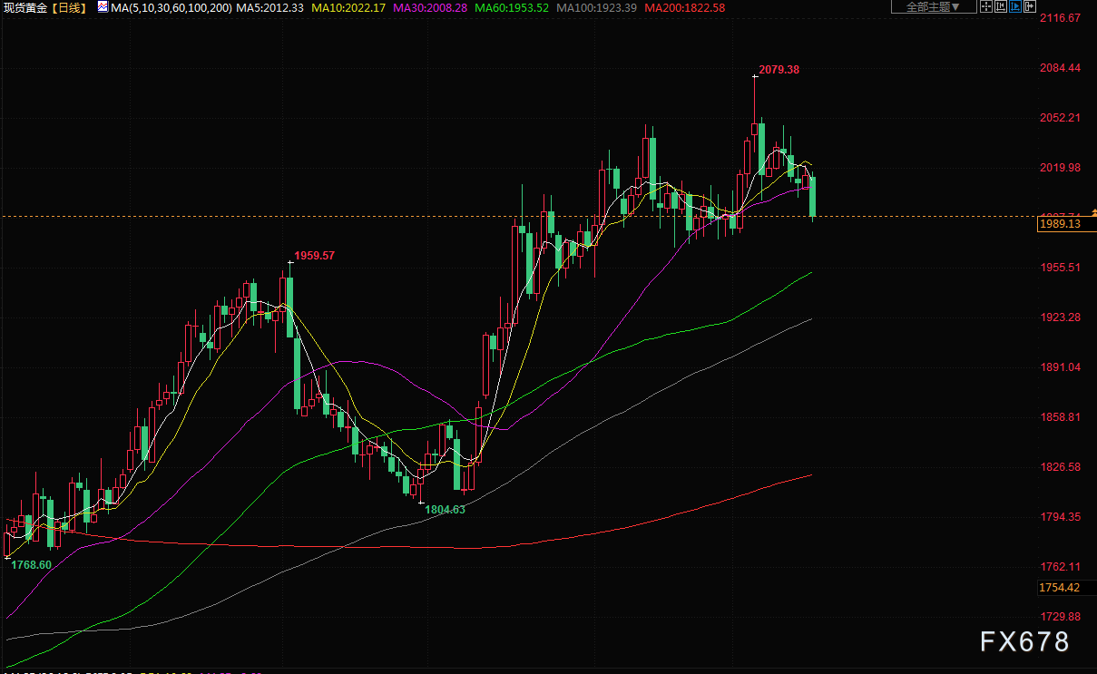 黄金周二跌破2000美元,此前美国经济数据和美联储官员的鹰派言论推动了对降息可能推迟的押注,同时交易员们密切关注美国债务上限谈判。