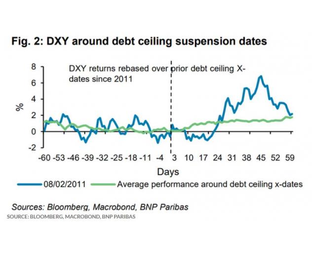 策略师们在上周日的报告中写道:“在我们看来,美国债务上限给美元带来了不对称的上行风险,虽然从历史上看,一旦债务上限被暂停或提高,美元往往要么反弹,要么持平。(见下图):