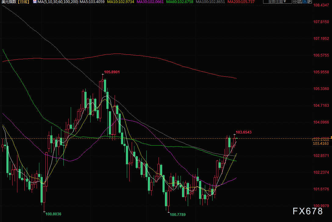 同时,好于预期的经济数据和包括布拉德和卡什卡利在内的地区联储总裁的鹰派发言提升了进一步加息的可能性,这也支持美元。美元指数一度触及103.65的3月20日以来最高水平,纽约盘尾报103.55。