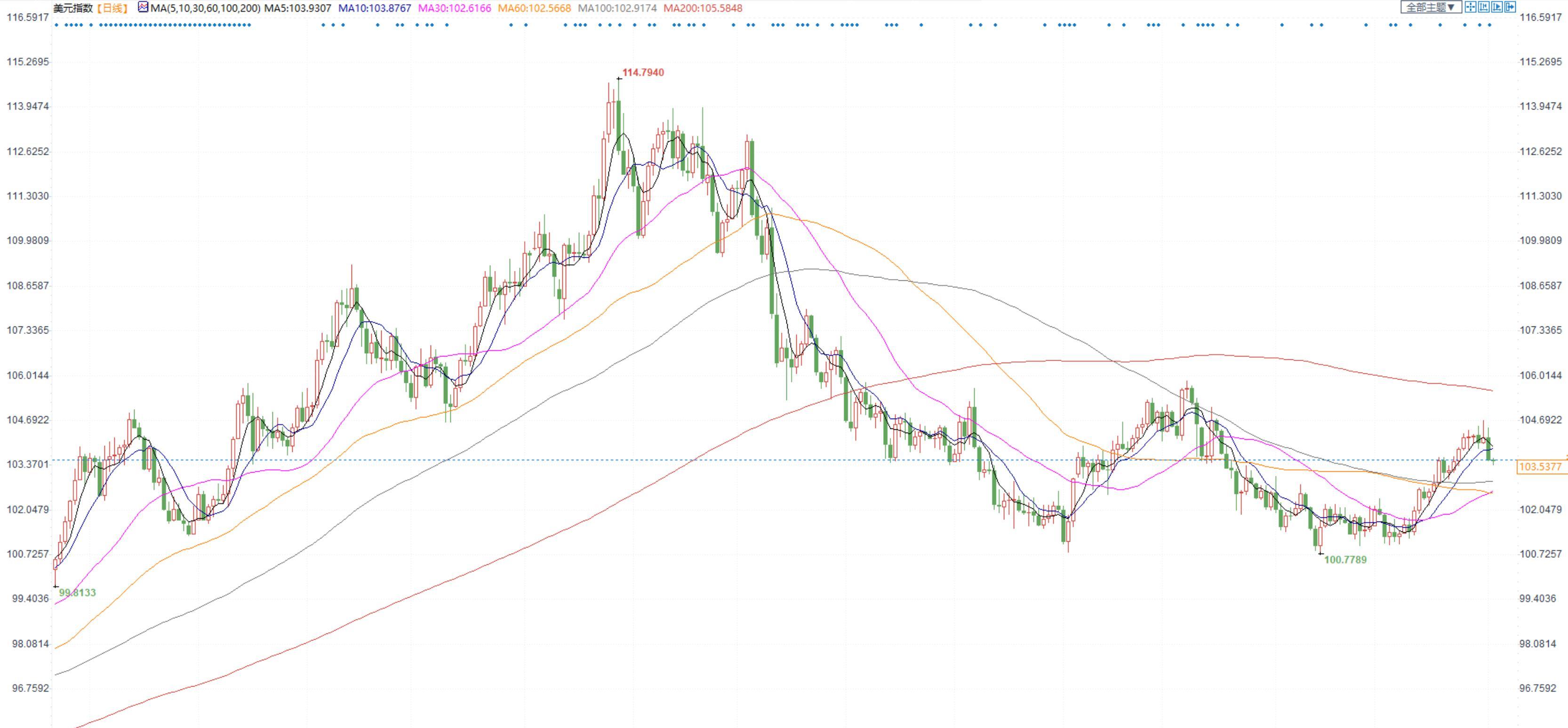 周五(6月2日)当周美元指数震荡回落,美联储官员向着暂停加息的态度转变施压美元,美国债务上限的担忧情绪缓和。