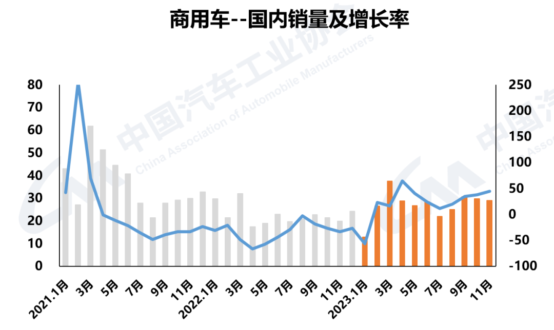 2023年1-11月,商用车国内销量297.4万辆,同比增长20.1%。