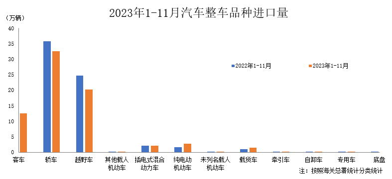 2023年1-11月,汽车整车共进口71.9万辆,同比下降11.7%;整车进口金额427.4亿美元,同比下降14%。在汽车主要进口品种中,与上年同期相比,轿车、越野车和小型客车进口量均较快下降。1-11月,上述三大类汽车品种共进口65.3万辆,占汽车进口总量的90.8%。