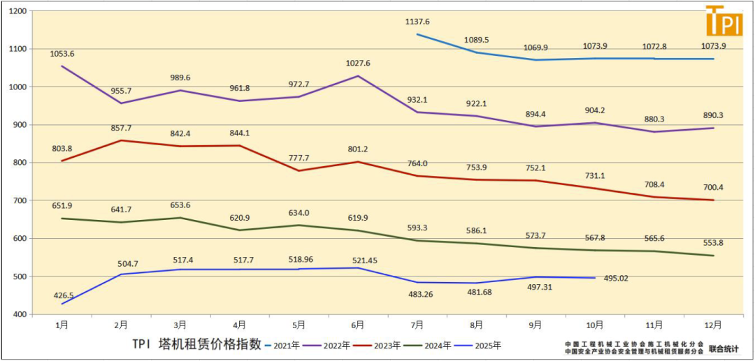 据中国工程机械工业协会施工机械化分会等统计的塔机租赁行业景气指数(TPI),2025年10月份塔机台天利用率57.0%,最大起重力矩利用率57.8%,分别较上月低0.3个百分点和0.2个百分点;10月份租赁价格指数为495.02点,较上月低2.29点,低于去年同期72.78点。