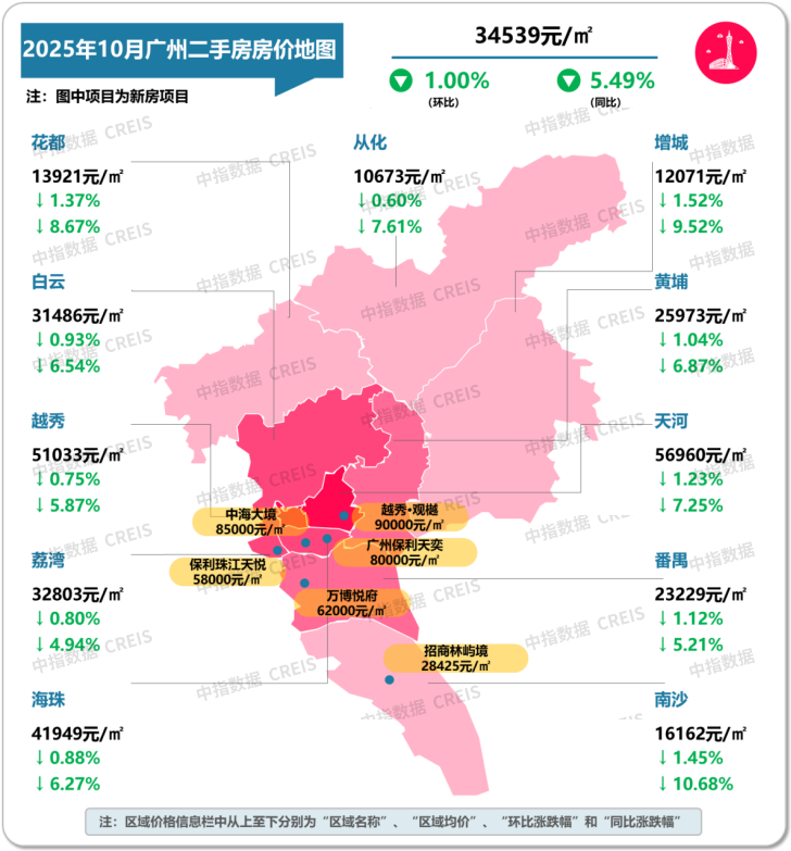 图:2025年10月广州各市辖区二手住宅挂牌均价及同环比