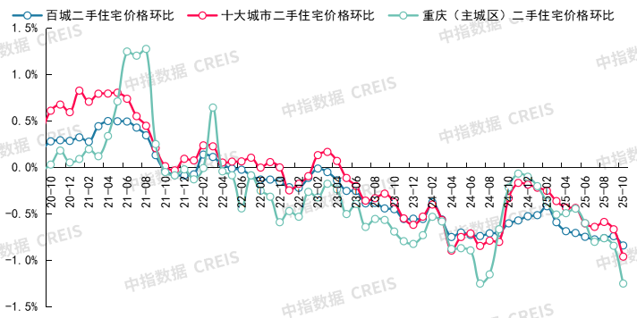 图:2020年10月至2025年10月重庆二手住宅价格环比走势