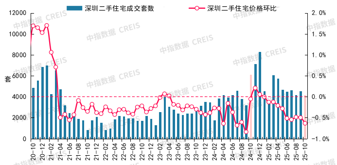 图:2020年10月至2025年10月深圳二手住宅成交套数及二手住宅价格环比走势