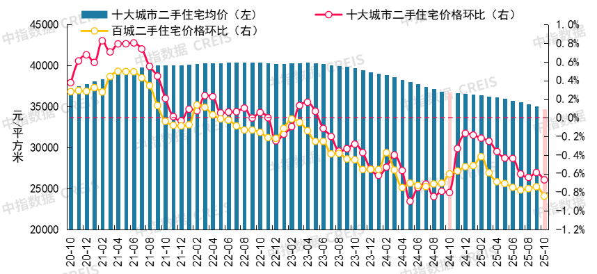 根据中国房地产指数系统百城价格指数,2025年10月,百城二手住宅均价环比下跌0.84%,同比下跌7.60%;十大城市二手住宅均价环比下跌0.96%,同比下跌4.77%。