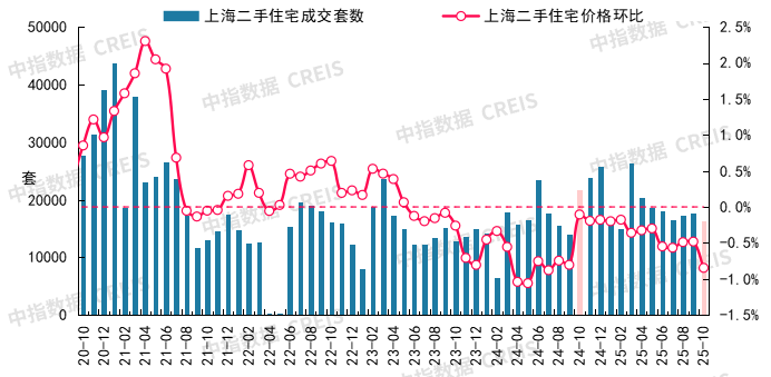 图:2020年10月至2025年10月上海二手住宅成交套数及二手住宅价格环比走势