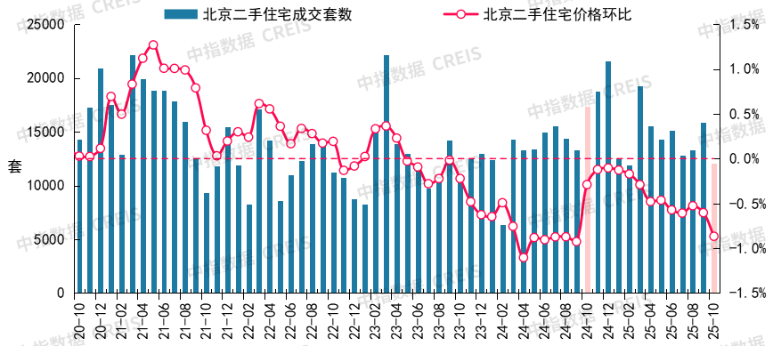 图:2020年10月至2025年10月北京二手住宅成交套数及二手住宅价格环比走势